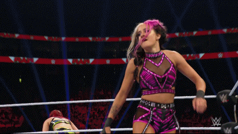 Raquel lifted IYO up for the Tejana Bomb (formerly Chingona Bomb) close to the ropes. Kai tried to come into the ring to assist her partner -- five second rule and all. The referee stopped her. Bayley's passion overcame her and she pulled IYO off Raquel. To be fair, Raquel should have been smarter than to attempt her finisher so close to where Bayley was standing. Did she not pay attention when Dakota taught her that? She's a second generation competitor, too. Back to the action. IYO came down on Raquel with a double stomp followed by Kai nailing the Kaio-Kick.