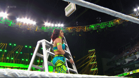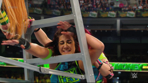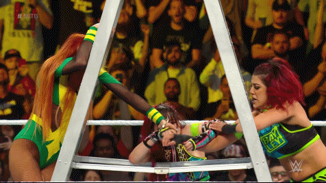 The Role Model picked up the ladder and climbed to the top, reaching a hand up to grab the briefcase. Becky hurried up the other side, using the hand that Trish had handcuffed like a mandible claw to force Bayley to the canvas. Lynch made her climb. Bayley recovered, hurrying up the opposite. SKY pulled Becky to the canvas but Lynch shot back with a big boot. It was down to Bayley and Becky. Fittingly, the very rivalry in which the dissension in Damage CTRL began to surface.