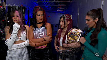 On The SmackDown LowDown, Bayley persisted that she called for the triple threat because she was certain Asuka was going to. She insisted it's a positive because IYO can prove she's the greatest. IYO told Bayley again that Asuka didn't say what Bayley thought followed by firmly telling her Damage CTRL sister that she can speak for herself. IYO took her leave. Bayley asked Dakota what Asuka said. Dakota said she didn't know. Bayley asked Dakota to talk to IYO. Dakota said she would. Our Captain is clearly stuck in the middle and frustrated.