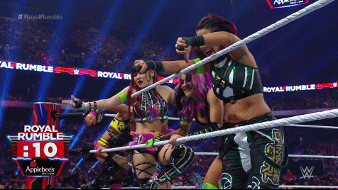 Damage CTRL exited between the ropes and attacked Becky at ringside. Lynch fought off Kai and SKY, meeting up with Bayley in the ring. Bayley tossed Lynch who went through the ropes instead of over. Bayley and SKY smashed Lynch into the barricade before Kai and SKY flung her over the commentary table. Hey, Becks earned herself some frequent fly miles so she should be grateful. Number 16 was Kai's former best friend Tegan Nox. Sadness. Kai found herself under attack by Nox who set her up for a gourdbuster only to nearly crack her head open with a knee strike.
