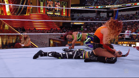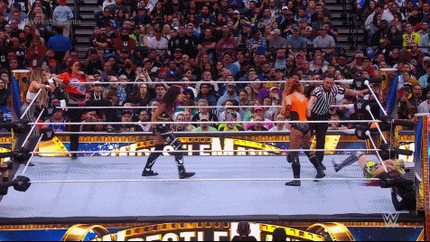 The trios came face to face, eye to eye. They slugged it out. Team Becky cleared the ring. The Ladies regrouped. The bell officially rang. Dakota and Becky started for their respective teams. Becky went for the Manhandle Slam but Kai fought free, stinging Lynch with the scorpion kick. The first of several kicks to come from The Captain of Team F'N Kick. The Ladies tagged in and out, beating the Bitter Hell out of Becky. Damage CTRL brought some triple team action to the grand stage, delivering the Kai N'SKY backdrop suplex into Bayley neckbreaker.