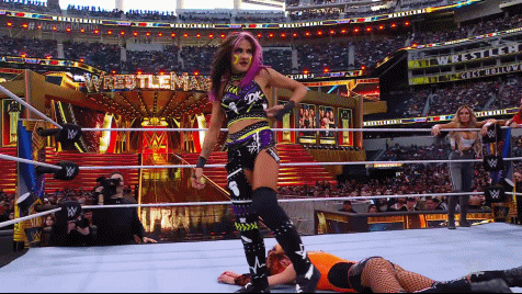 The action spilled back and forth. Our Captain kicked back into the fray, sending Lita to oblivion and back with the Kaio-Kick. Stratus took Kai to the canvas with the Stratusfaction. The chaos went back to the floor. SKY got her first iconic IYO WrestleMania Moment, gliding off the top rope to everyone on the floor with a moonsault. The referee was counting to ten. Everyone barely made it back into the ring to break the count. The war continued. Everyone squared off and fought to a finish.