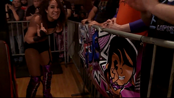 The beloved Evie did not celebrate her hard-earned victory. Instead she helped KLR to her feet, raising her hand and embracing her to acknowledge KLR's equally hard-fought effort. Before Evie made her way to the back, she stopped to acknowledge and fangirl over a creative banner that a group of regulars made for her that often appeared at Shimmer shows she worked. Our Captain is the best to her fans.
