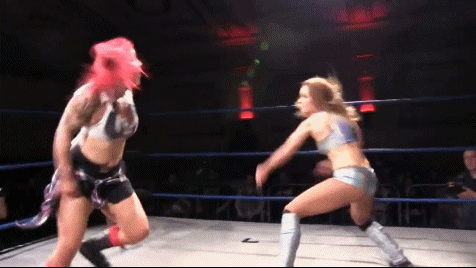 Evie couldn't even make a full entrance getting whacked in the face with a steel chair as she posed on the apron. Kellyanne pulled a table out from under the ring and set it up in the corner. The action spilled to the floor with Evie trying to whack Kellyanne with the steel chair. Kellyanne ducked the swing and battered Evie into the side of the ring. Evie came back striking Kellyanne with both a sliding knee and running PK from the apron.