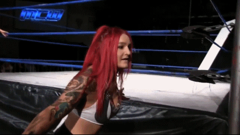 Kellyanne stayed afoot lunging back at Evie who planted her with a uranage backbreaker. Evie charged Kellyanne in the corner and struck her with the Yakuza kick. She proceeded to hit a second with a bit of a spin to it for more impact. She planned to go for a third but Kellyanne cut her off, plowing Evie through the table in the corner with another cannonball. Both managed to their feet but Evie was worse for wear, the back of her head smashed hard through the table moments earlier. Kellyanne pulled a garbage can out from under the ring and tossed it into the squared circle.